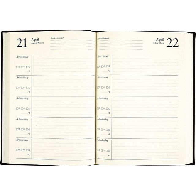 En dag per sida som sträcker sig över fem år, årsneutral. För dagboksnoteringar, att notera viktiga händelser i och för att kunna följa vädrets skiftningar från år till år. Innehåller namnsdagsregister. Cognac, inbunden konstläder. Format 142 x 205 mm.