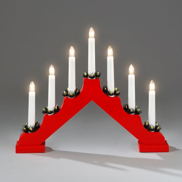 Lys upp fönster med denna klassiska adventsljusstake i lackerat trä. En kassisk 7-armad ljusstake i trä med varmvita lampor. Lackad i rött. Anslutningssladd på 1,7 meter. Strömbrytare för manuell avstängning/påslagning. Höjd 30 cm och bredd 38 cm. - Färg: Röd - Ljusfärg: Varmvit - Material: Trä - Bredd: 39cm - Höjd: 32cm - Djup: 5,5cm - Sockel: E10 - Anslutningskabelns längd: 160cm - Ljuskälla ingår - IP20/230V