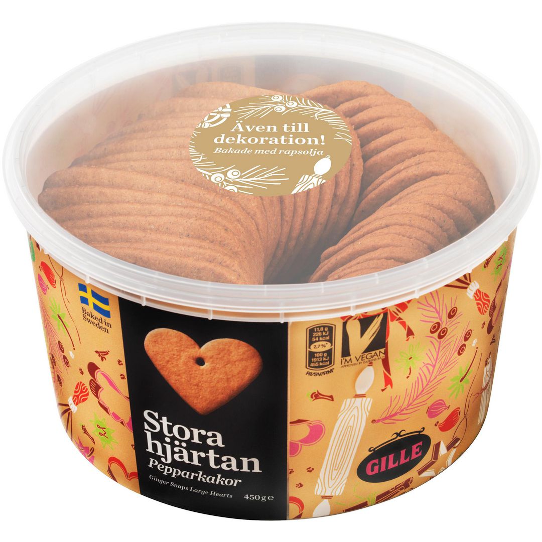 Ha en riktigt god och fröjdefull jul! Klassiska stora och spröda hjärtan med smak och doft av kanel, ingefära och nejlika. Med hål för upphängning. Nu tunnare och bakade med rapsolja. Lika goda som dekorativa. Vegansk. - 450 gram