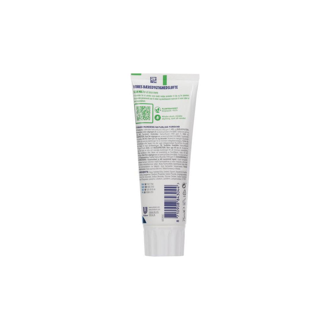 Zendium Classic är en mild fluortandkräm smaksatt med pepparmint. Tandkräm ZENDIUM Classic är en mild lågskummande tandkräm. Tack vare det milda skummedlet är den lämplig för personer med torra och känsliga munslemhinnor. ZENDIUM Classiv innehåller bl a natriumfluorid, som förebygger karies, samt enzymer och proteiner som hjälper till att aktivera ett av salivens naturliga antimikrobiella system. - Innehåller zink som motverkar dålig andedräkt - Extra milt slipmedel - Mild mintsmak. - Tub av 60 % växtbaserad bioplast. - Innehåller små mängder ägg- och mjölkprotein - Volym: 75 ml