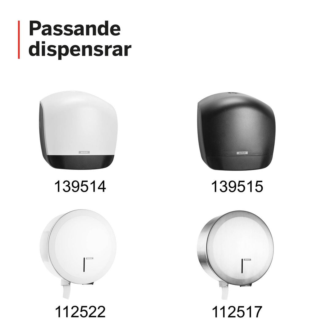 Stor toalettrulle av bra kvalitet, lämplig för mindre till medelhög förbrukning Katrin Gigant är en vit produkt som är skonsam för huden och som räcker längre. Denna produkt lever upp till de förväntningar besökare har på offentliga utrymmen. - 2 lager - Antal ark/rulle: 1600 - Certifiering: Svanen-miljömärkning - Uppfyller: ISO 9001, ISO 14001 - Färg: Vit - Pappersvikt: 16,5 g/m² - Längd per rulle: 200 m - Rullbredd: 98 mm - Ark: 125 x 98 mm - Diameter: 190 mm - Kärnans diameter: 60 mm - Svanen: Licensnummer 305006 Passar till: Katrin Gigant S Dispenser.